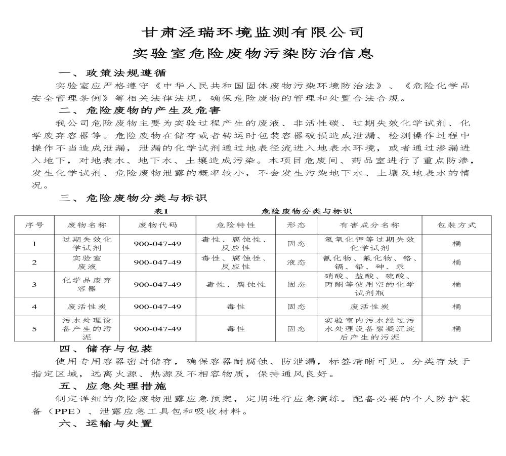 甘肅涇瑞環(huán)境監(jiān)測有限公司實(shí)驗(yàn)室危險(xiǎn)廢物污染防治信息