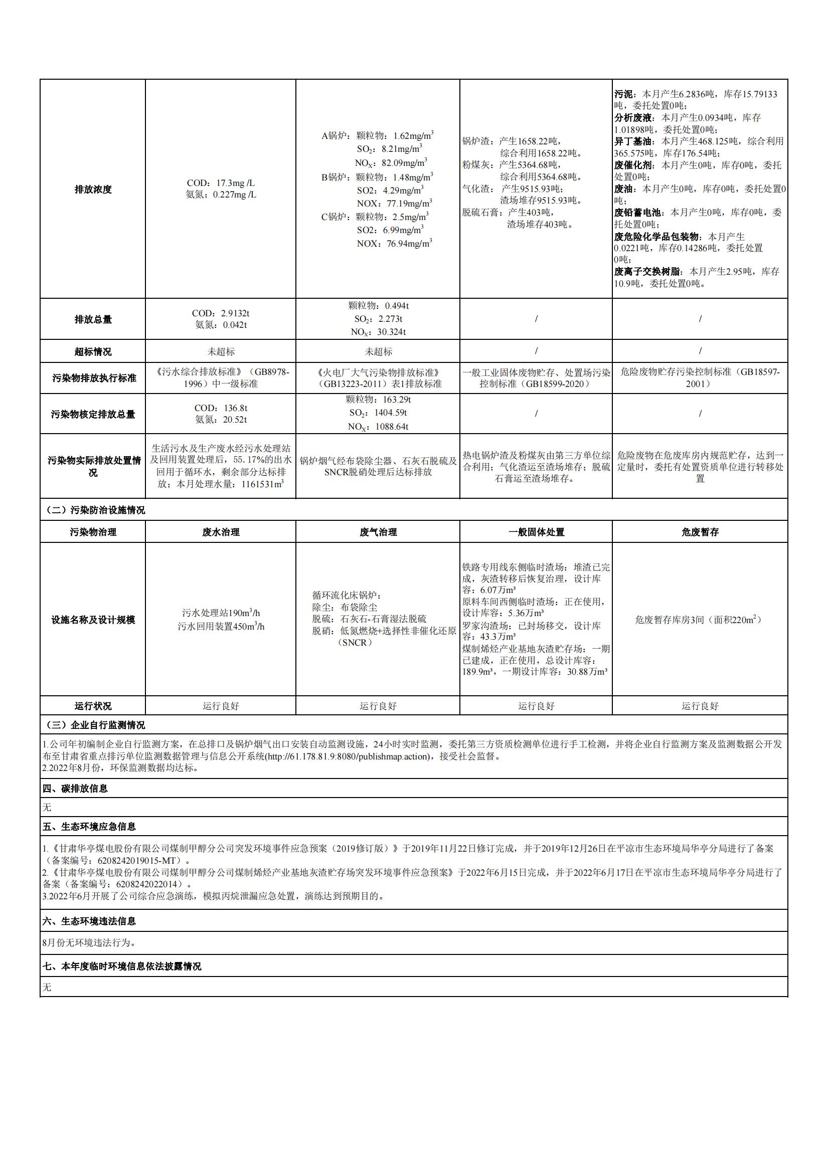 煤制甲醇分公司環(huán)境信息公開(kāi)內(nèi)容(2022年8月)